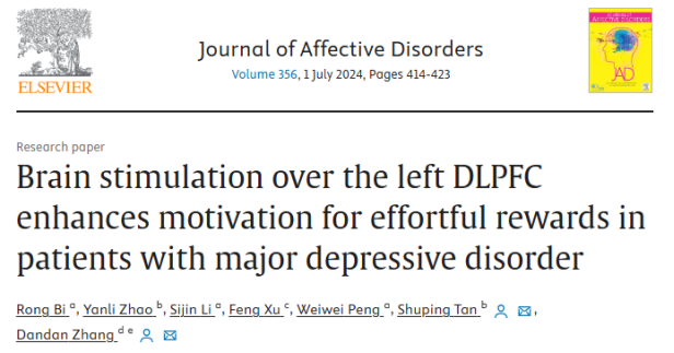 Bi, R., Zhao, Y., Li, S., Xu, F., Peng, W., Tan, S., & Zhang, D. (2024). Brain stimulation over the left DLPFC enhances motivation for effortful rewards in patients with major depressive disorder. Journal of Affective Disorders, 356, 414-423.